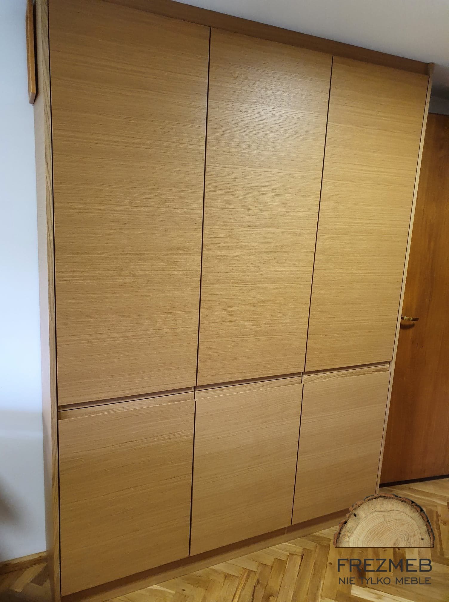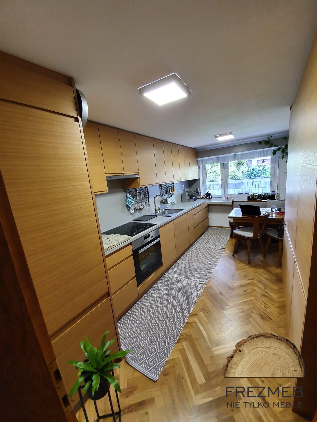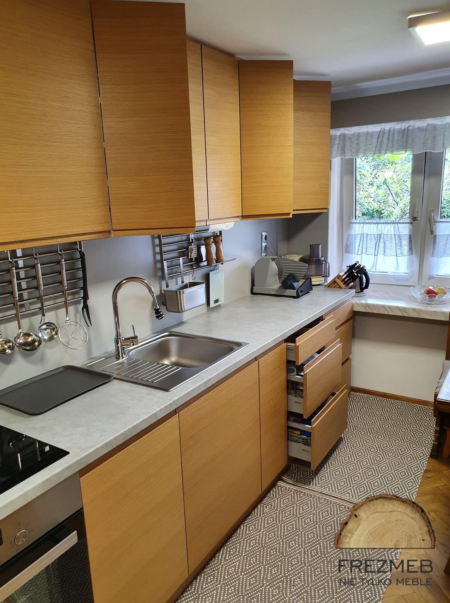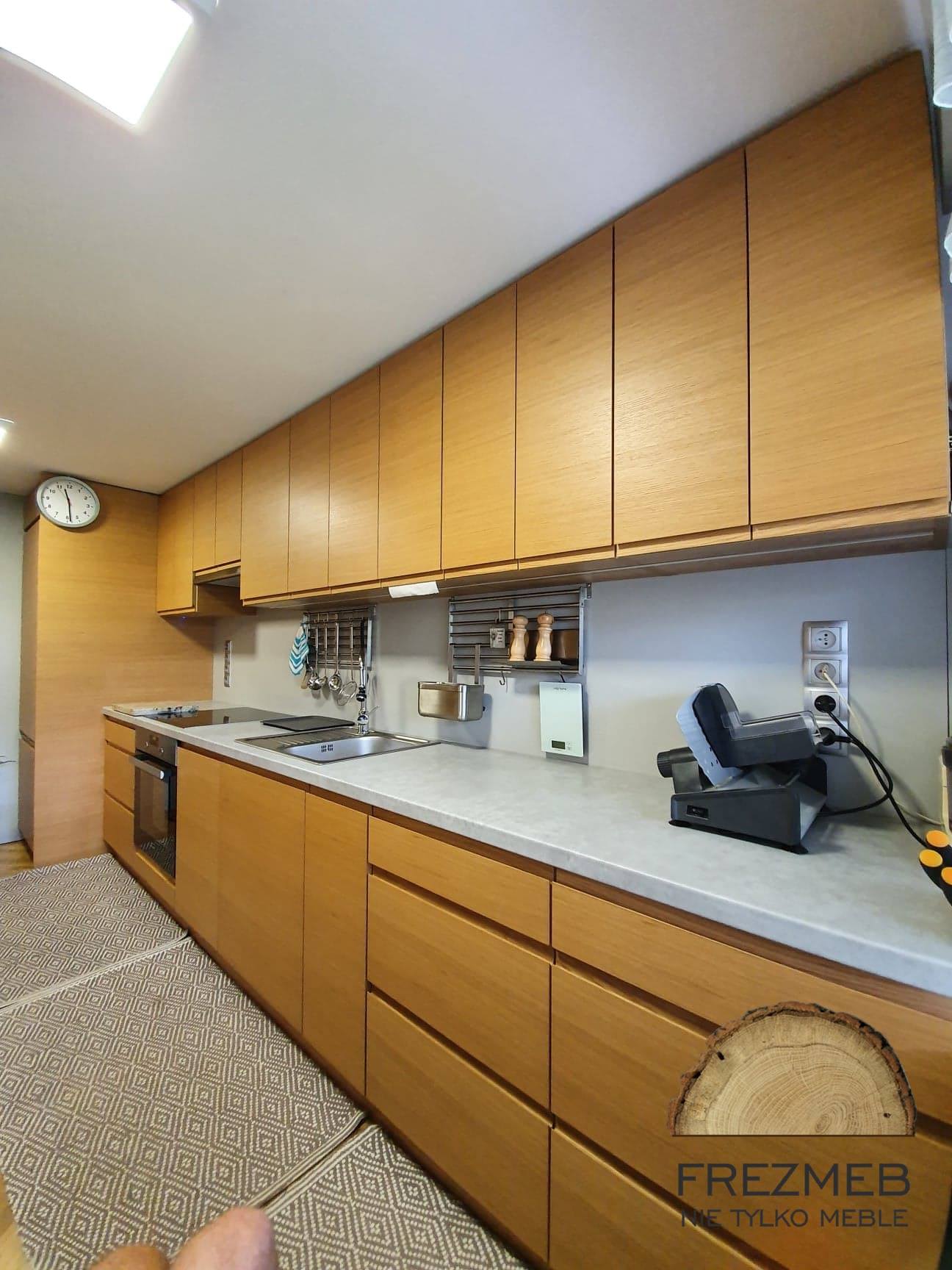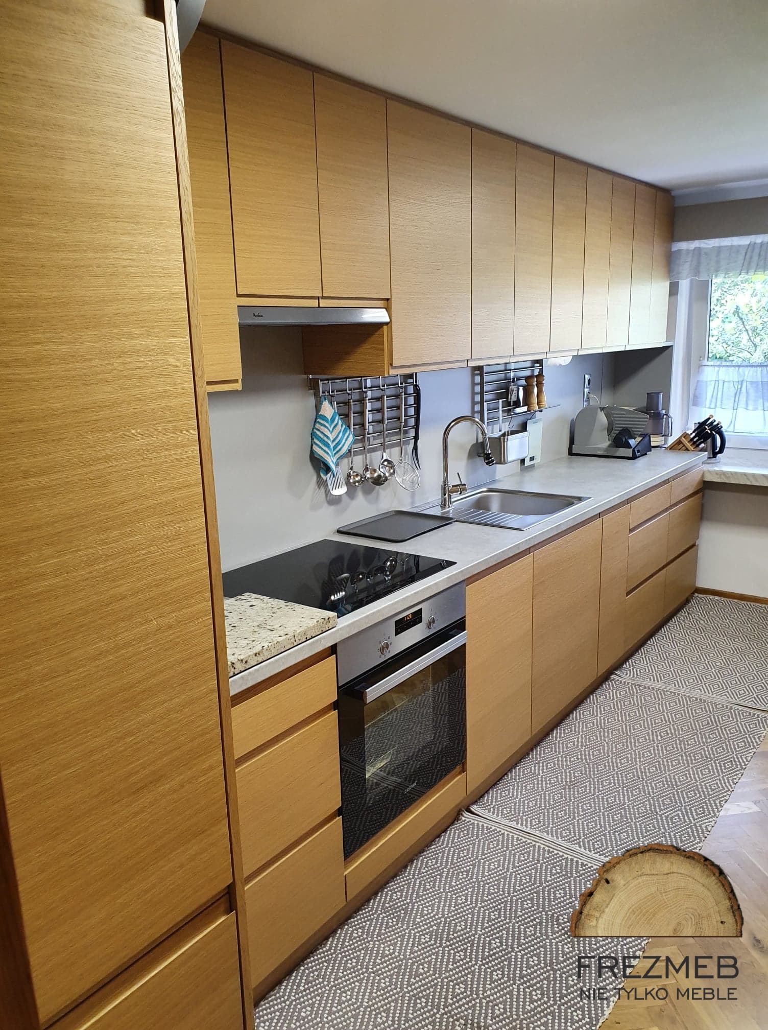 Kuchnia na wymiar w której zastosowano fronty - okleina naturalna Dąb z uchwytami krawędziowymi. Wykorzystano szuflady oraz zawiasy firmy Blum.