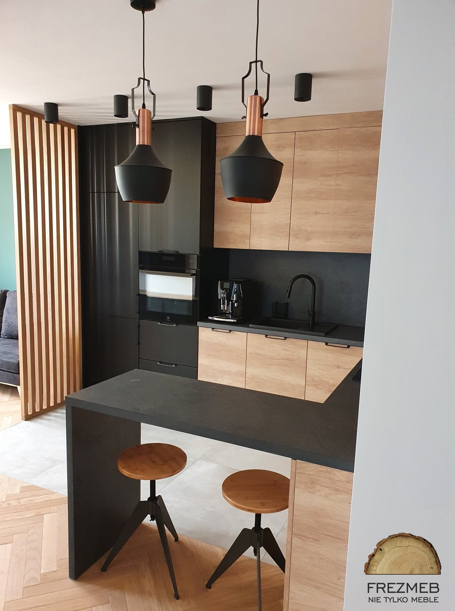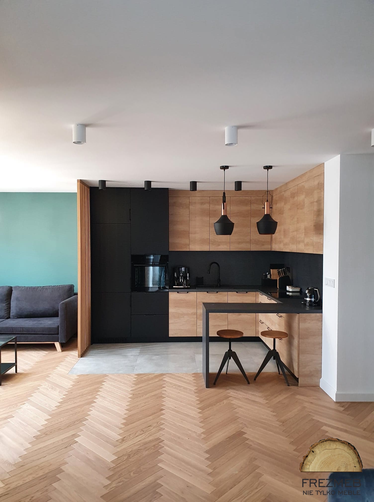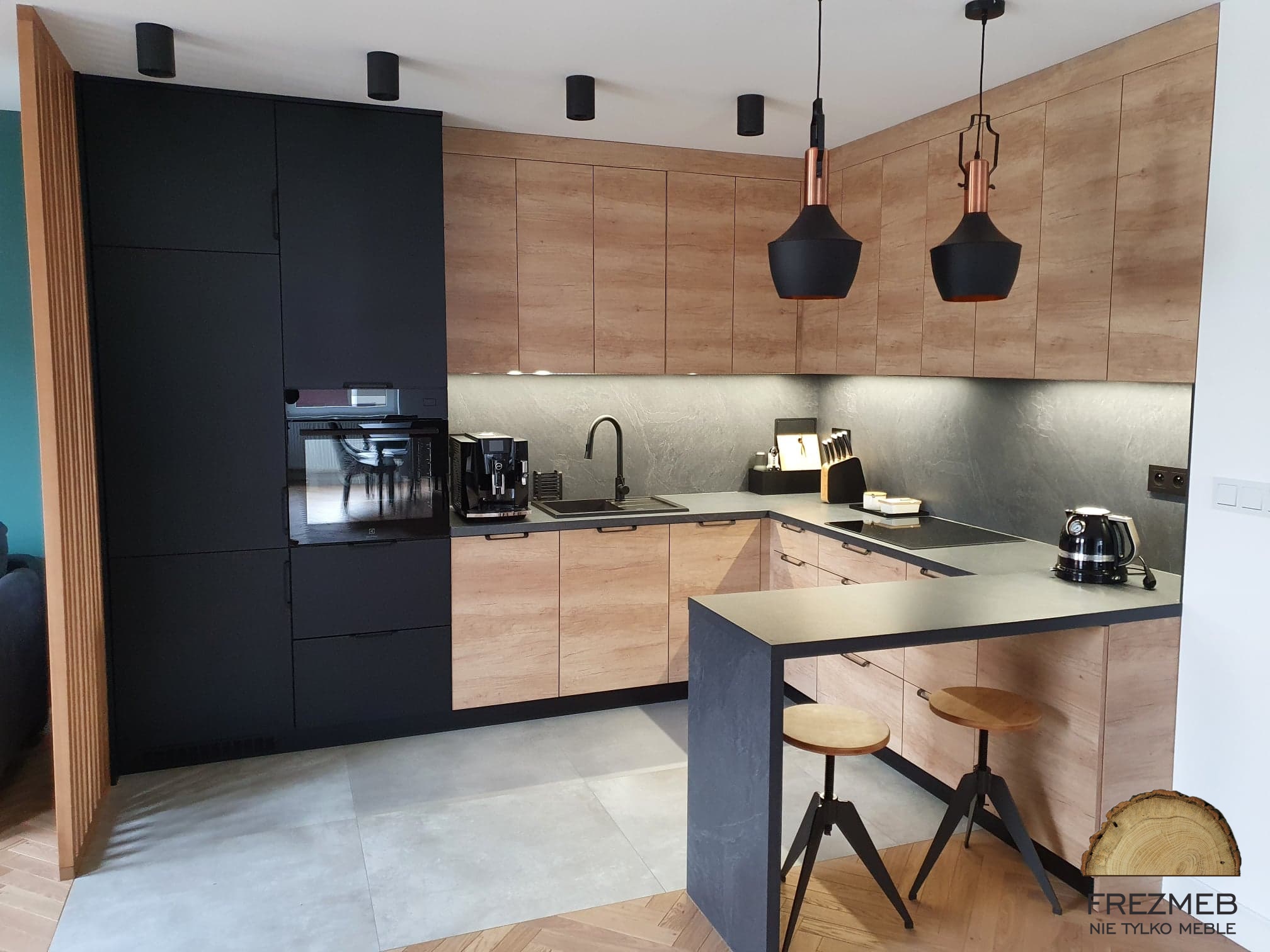 Fronty meblowe wykonane z czarnego lakieru w macie oraz drewnopodobnej płyty meblowej