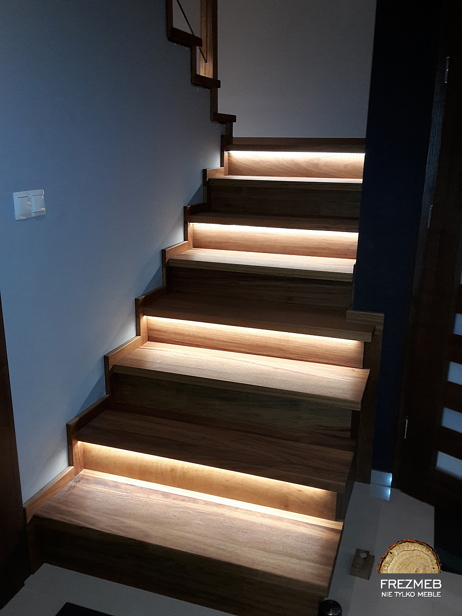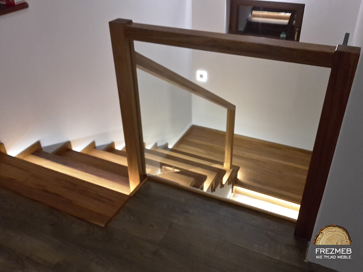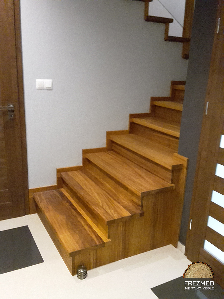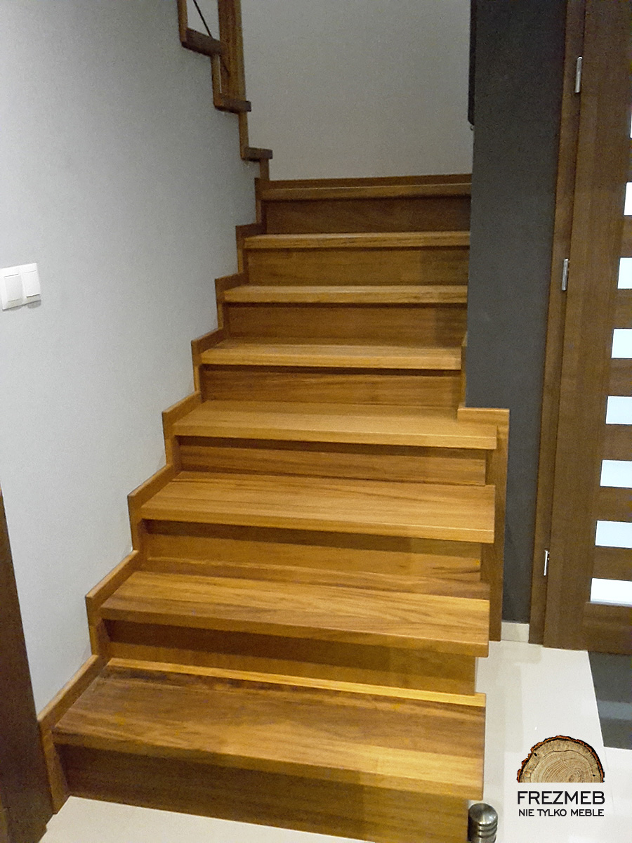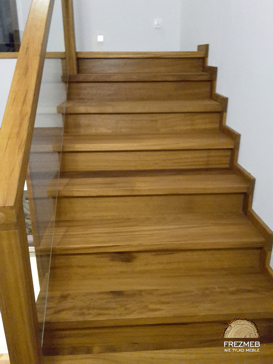 Schody wykonane z drewna egzotycznego IROKO, olejowane.